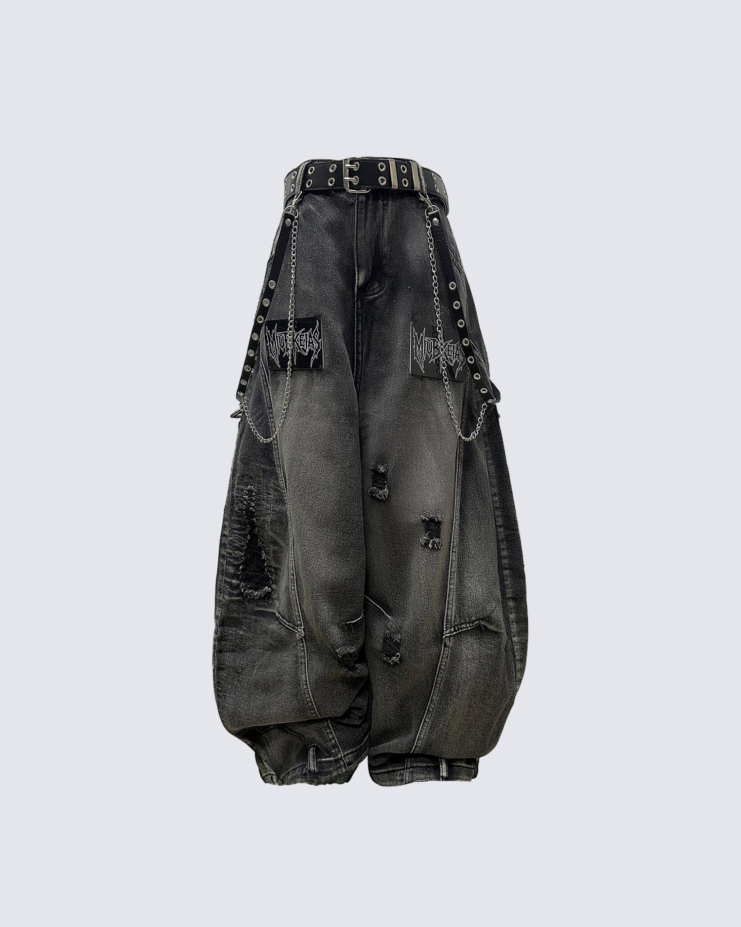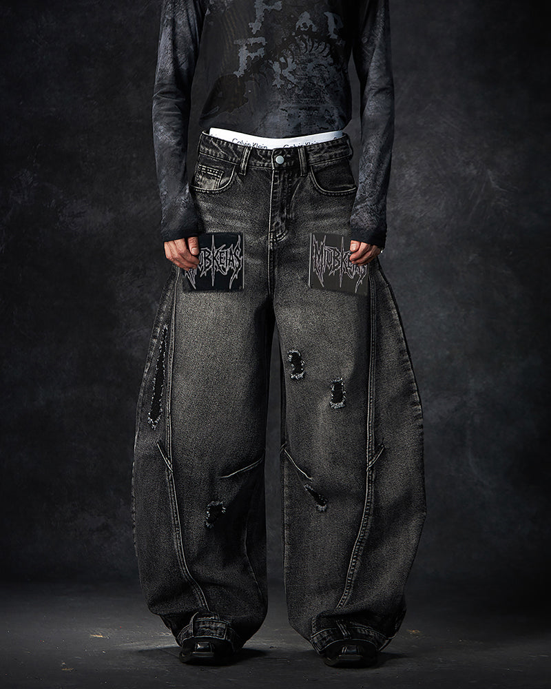 Letter print, distressed holes, wide-leg fit, avant-garde vibe, relaxed silhouette, blade-cut detail