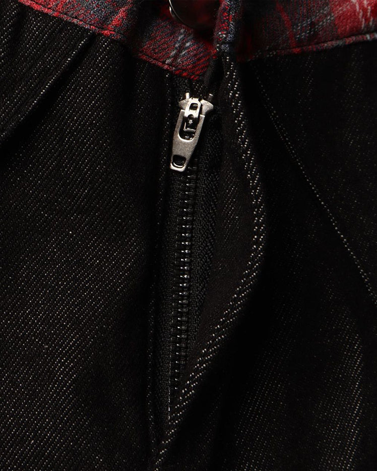 Plaid fabric patchwork, denim texture, straight-leg cut, contrast stitching, washed finish, relaxed fit, vintage-inspired street aesthetic