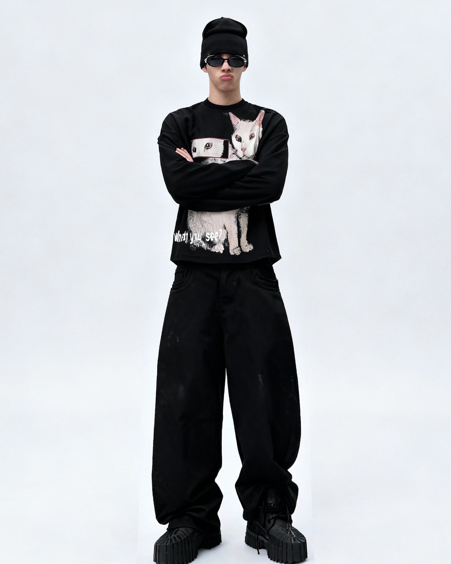 Design Elements: Oversized cat graphic print, “What do you see?” slogan detail, crewneck, long sleeves, relaxed fit, waffle knit texture, artistic street vibe