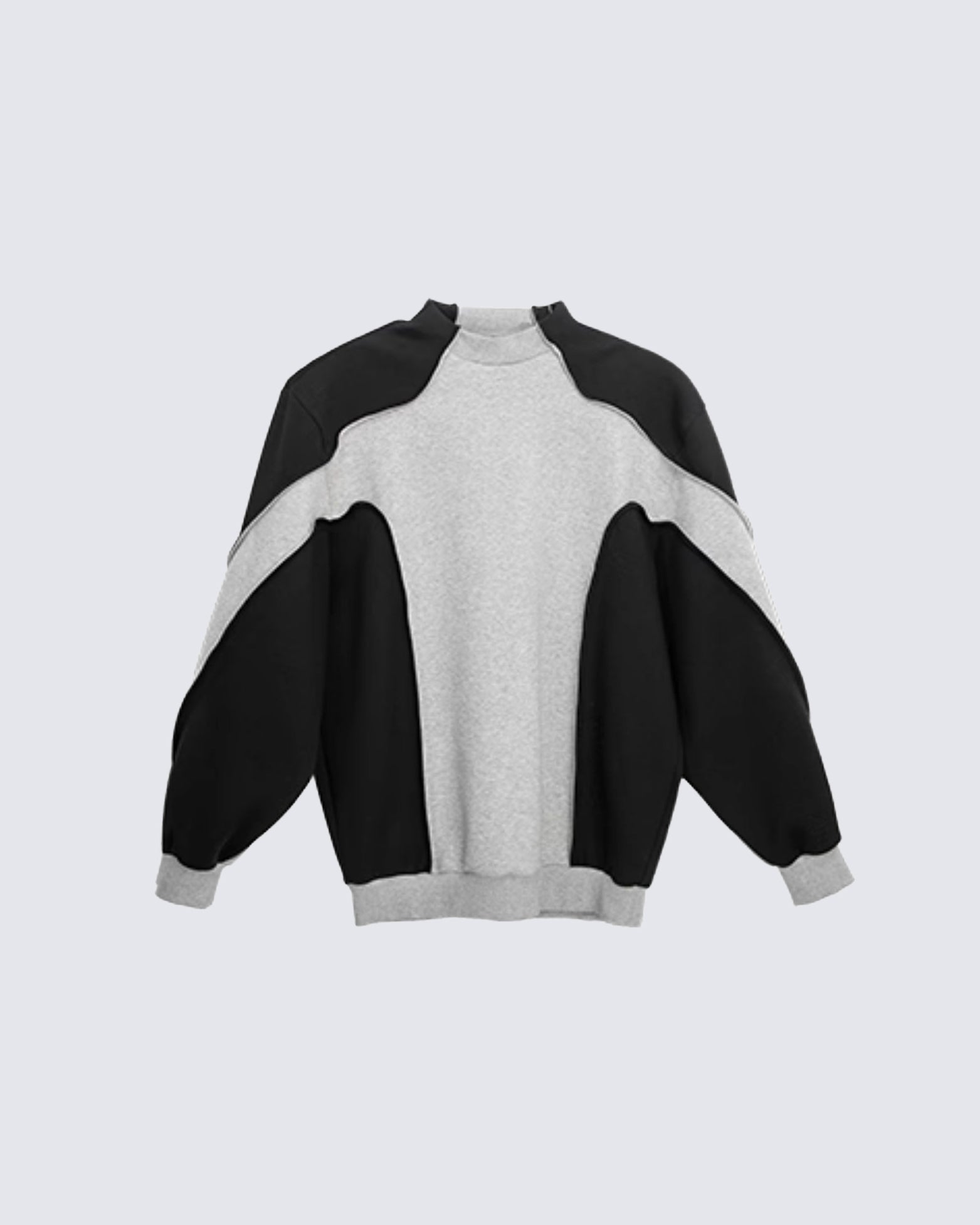 Contrasting color panels, deconstructed seams, structured air-layer fabric, relaxed American streetwear silhouette.
