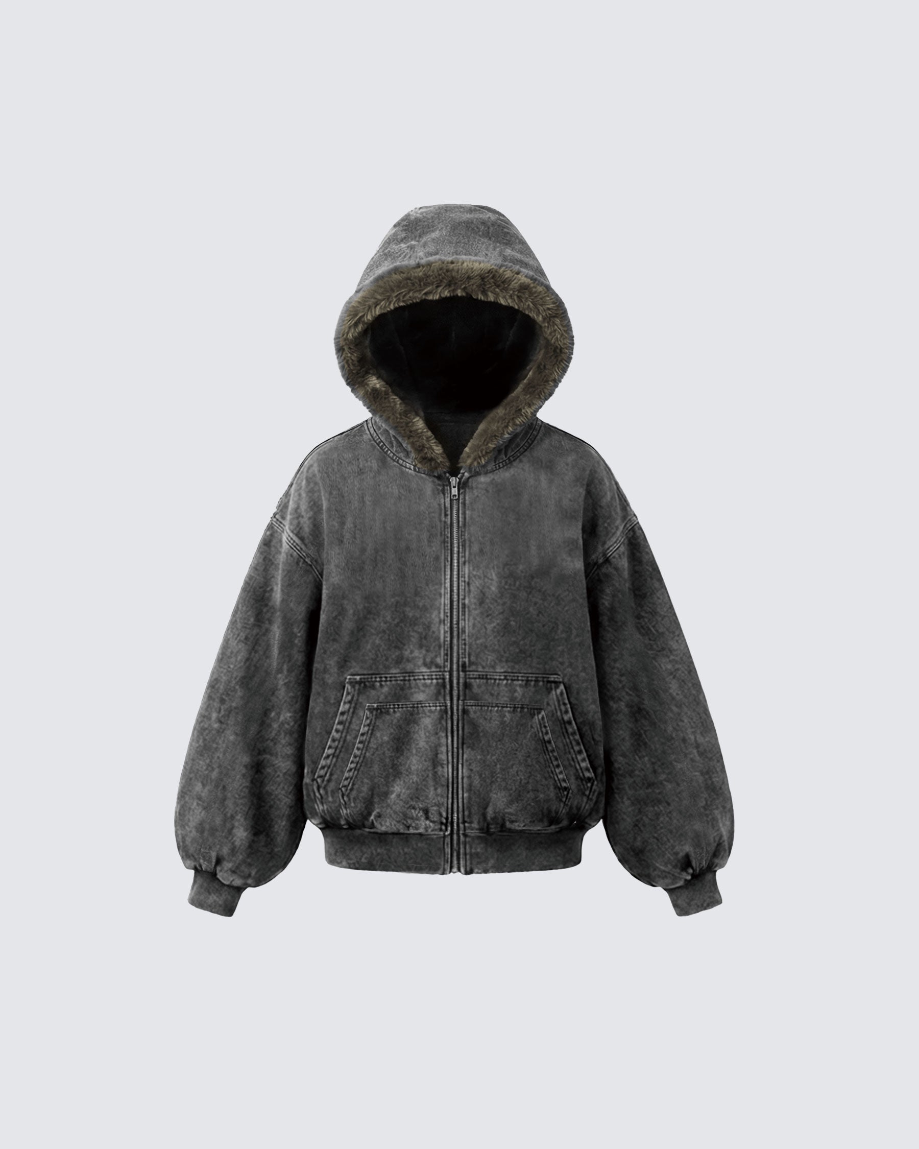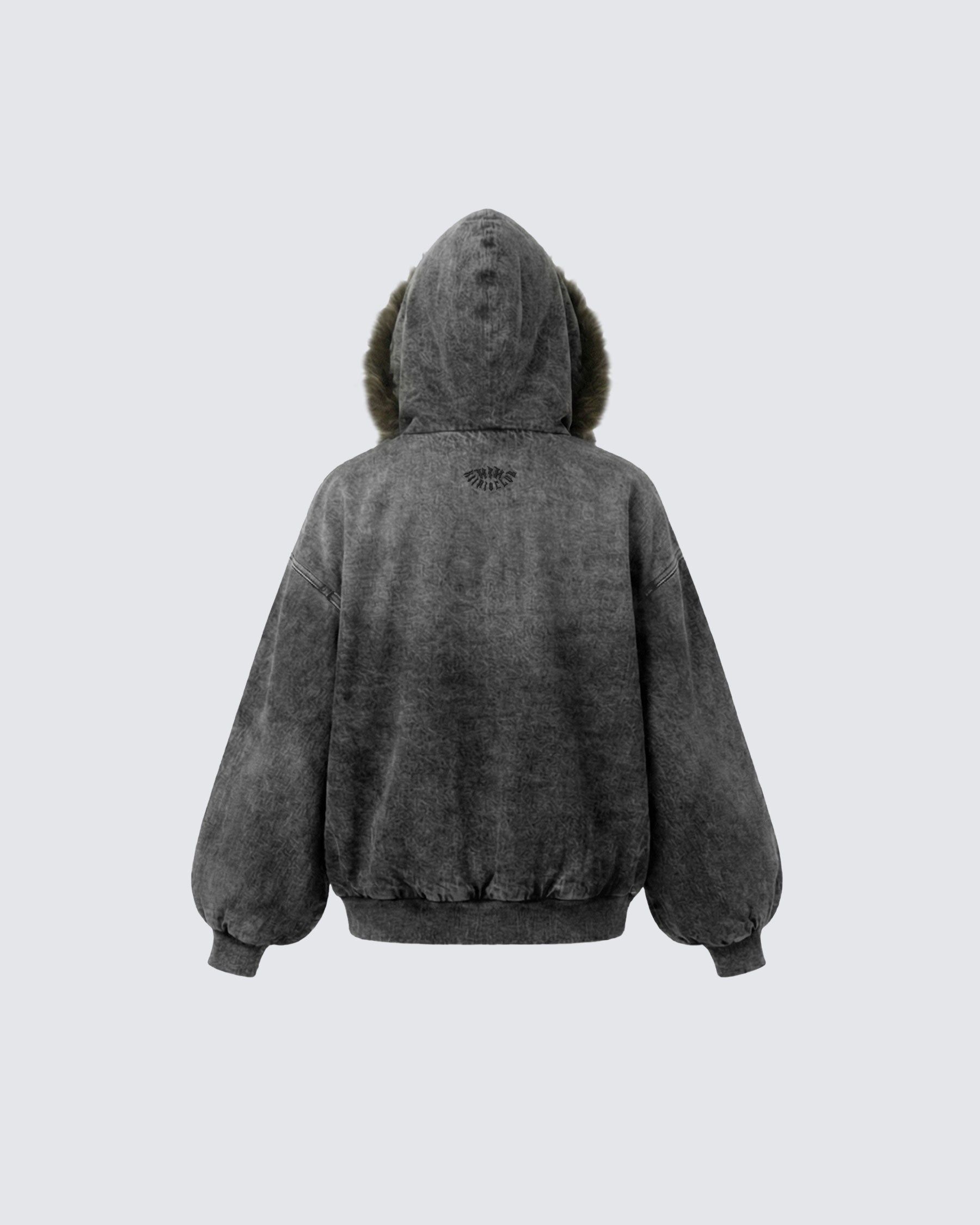 Features a hood trimmed with plush faux shearling, creating a play of contrasting materials.