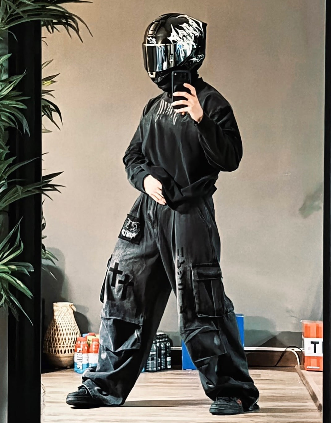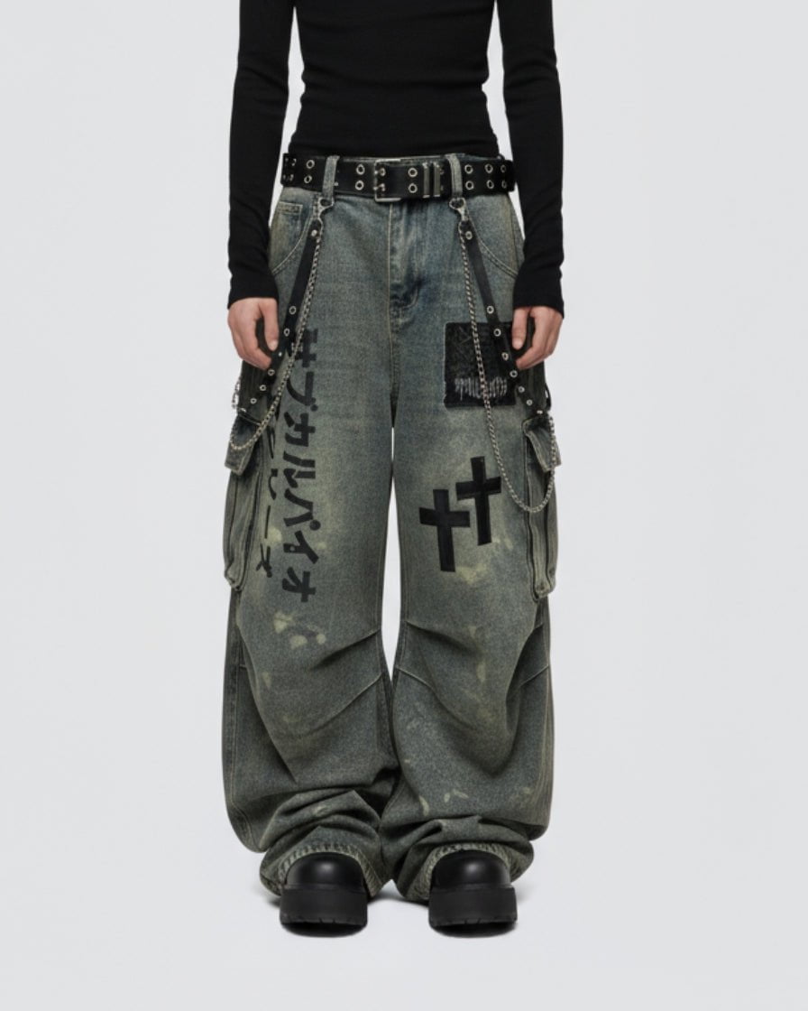 Dark Graffiti Patchwork Cargo Jeans(Free Belt and Chain Included)