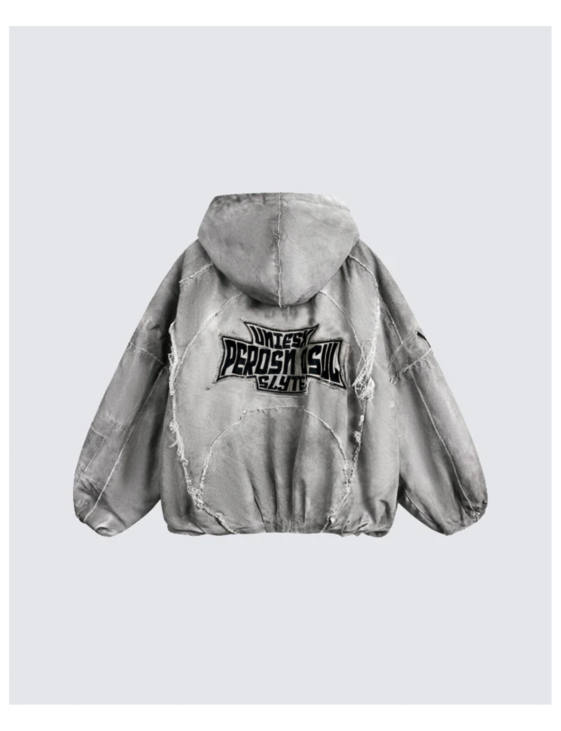 This hooded jacket combines a distressed aesthetic with embroidered details, featuring a padded design that offers both warmth and a stylish streetwear vibe.