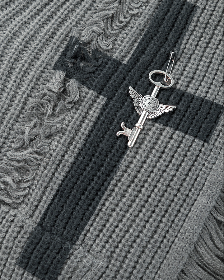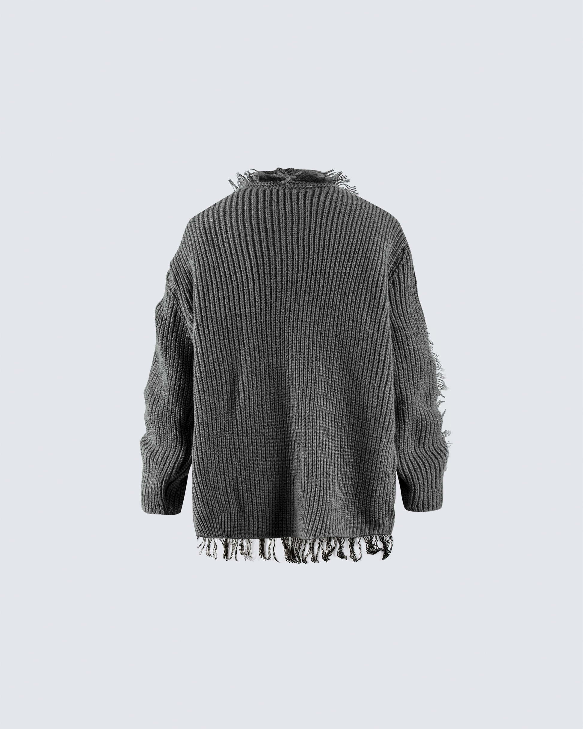 Design Elements: Distressed edging, open-front design, relaxed silhouette