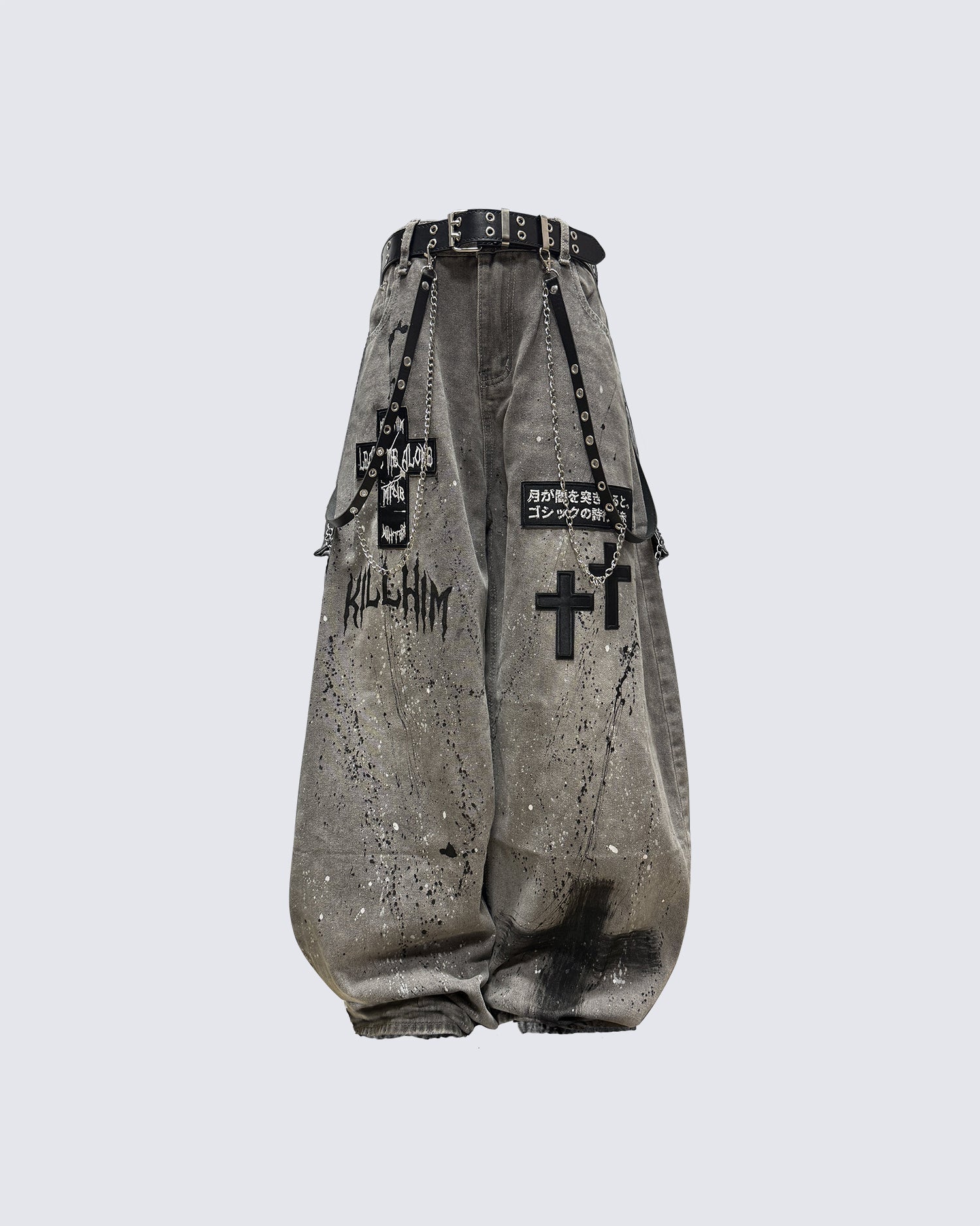 Distressed washed effect, paint-splatter details, patchwork design, wide-leg silhouette, relaxed fit, blade-cut elements, rebellious wasteland vibe