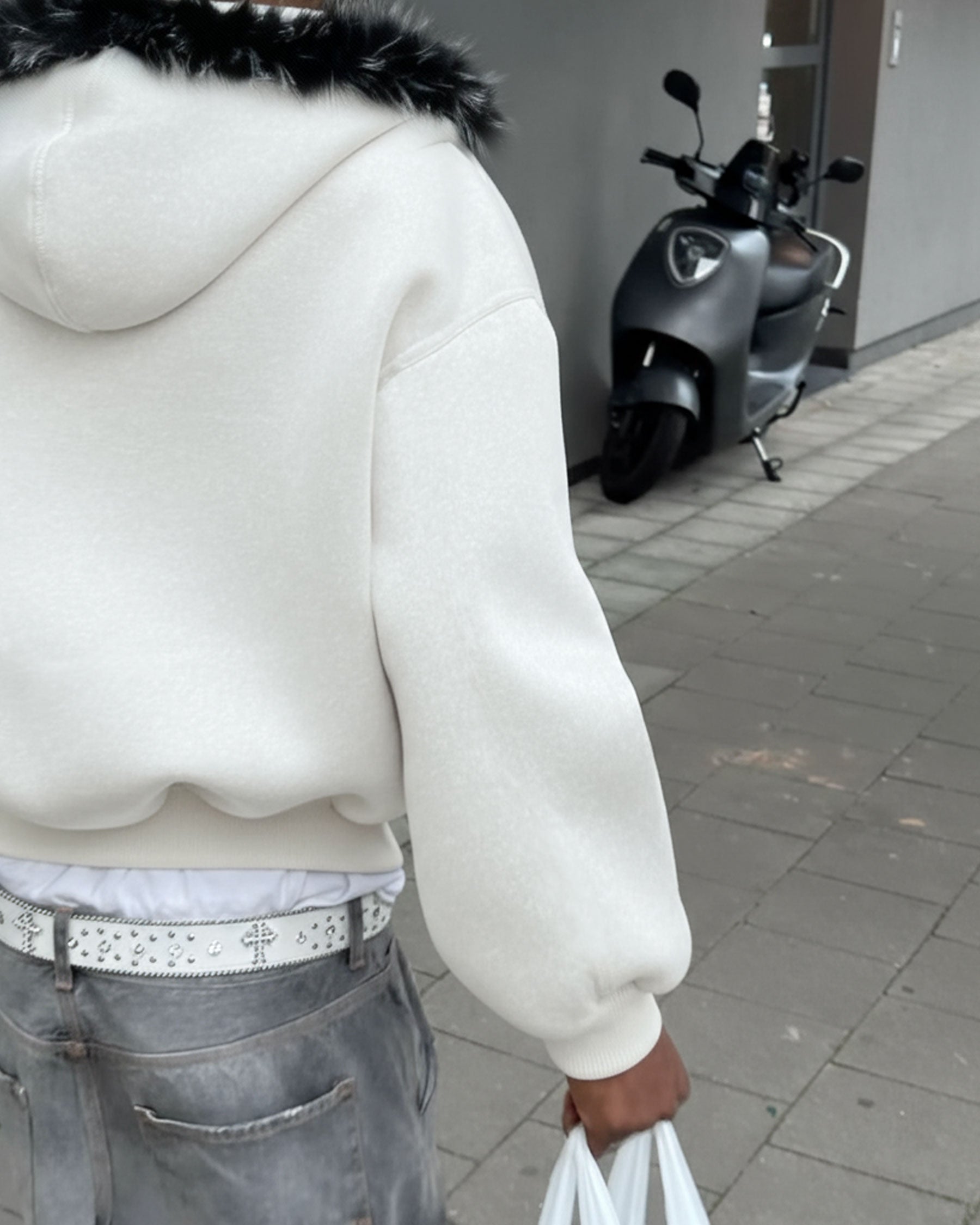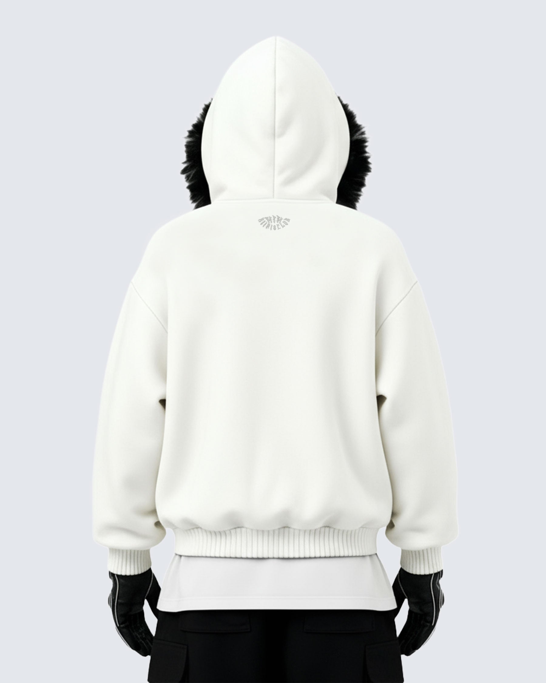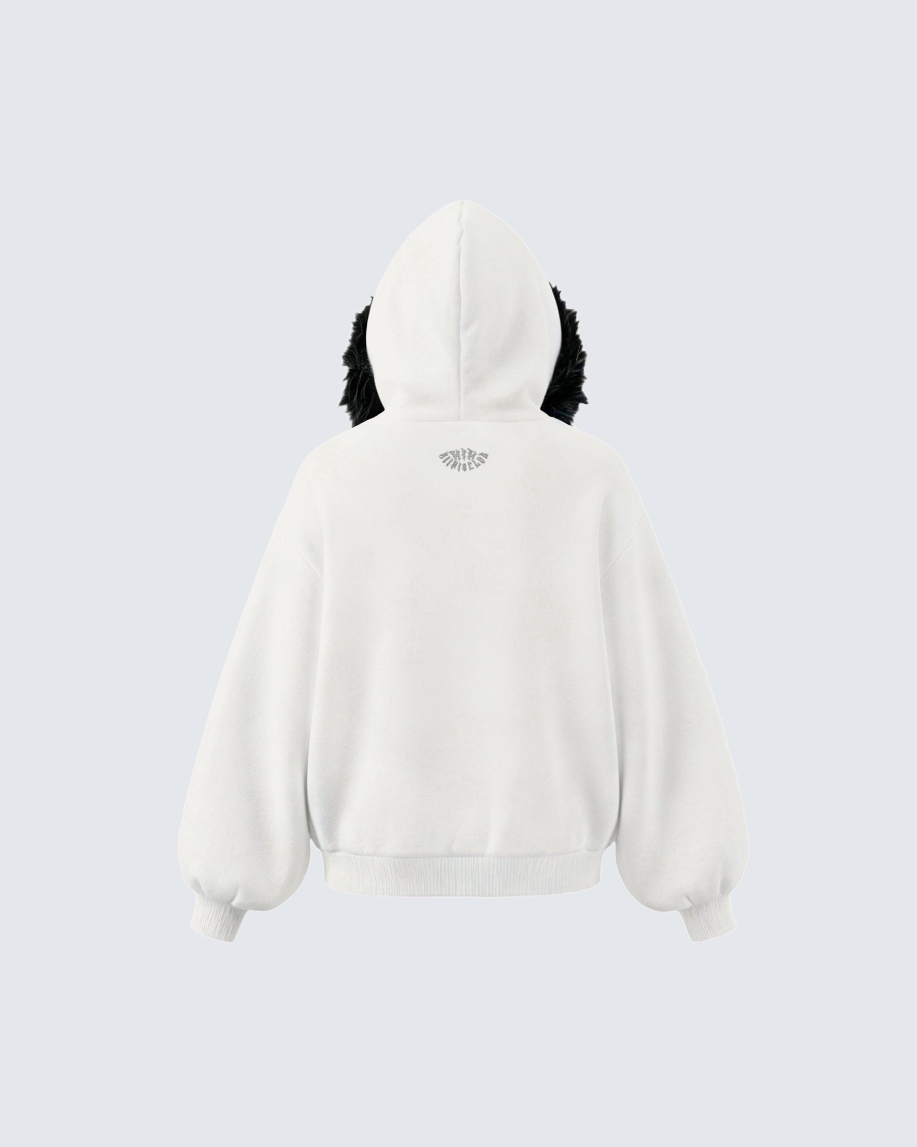 Hood with plush faux fur trim and KIIKIOCLUB embroidery on the back.