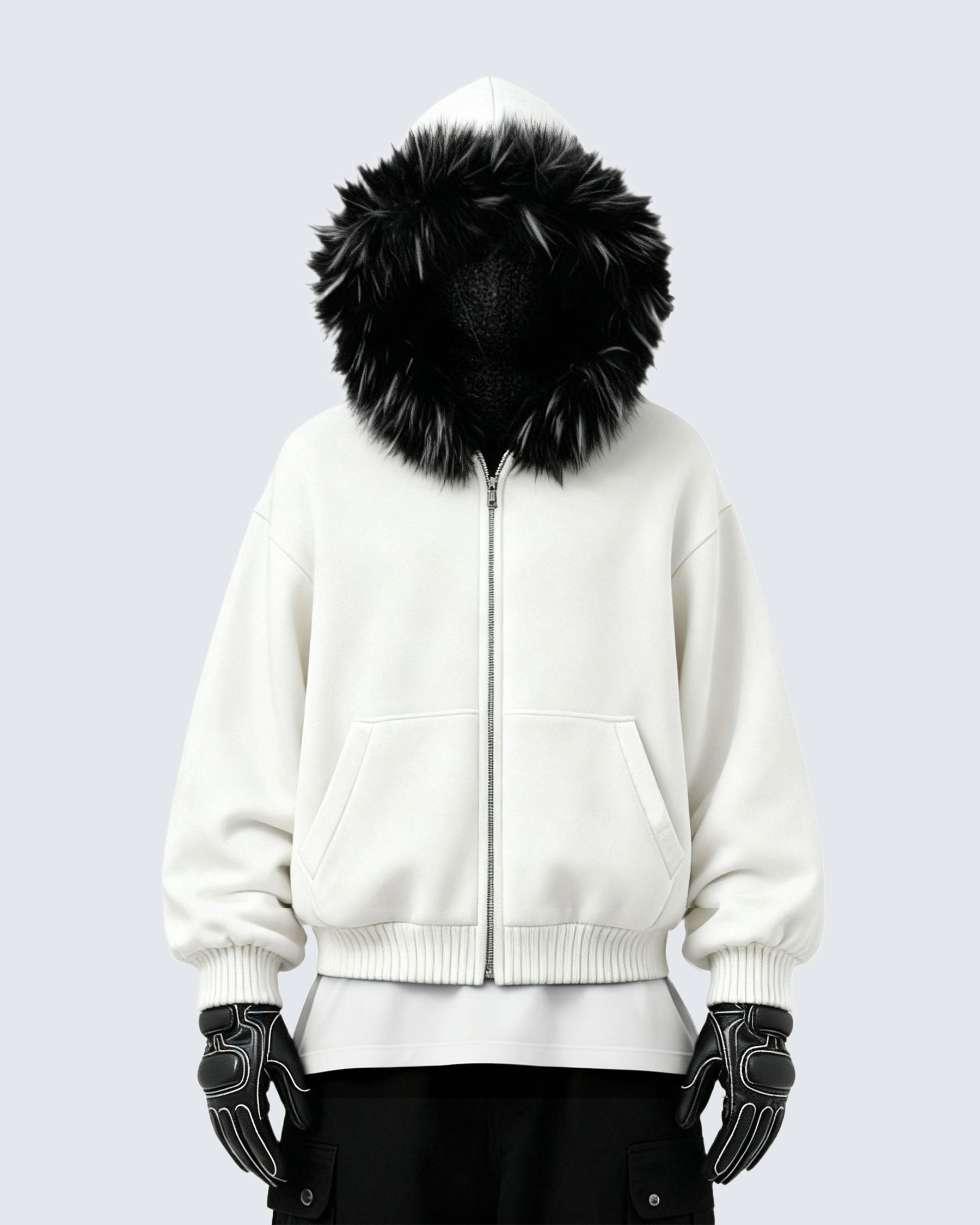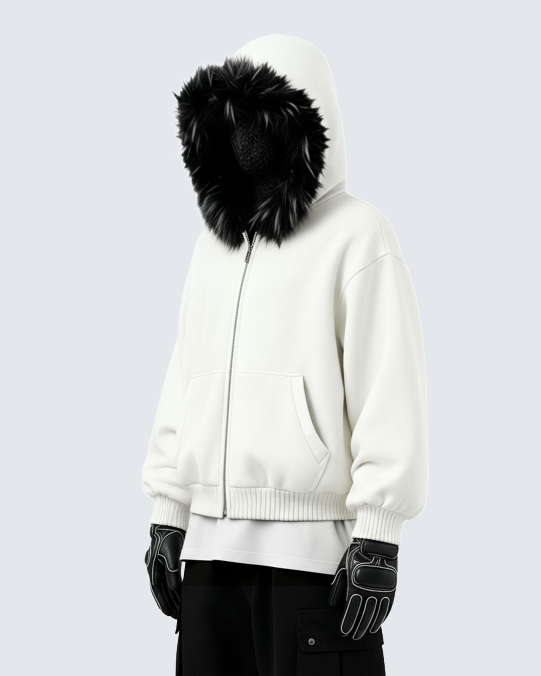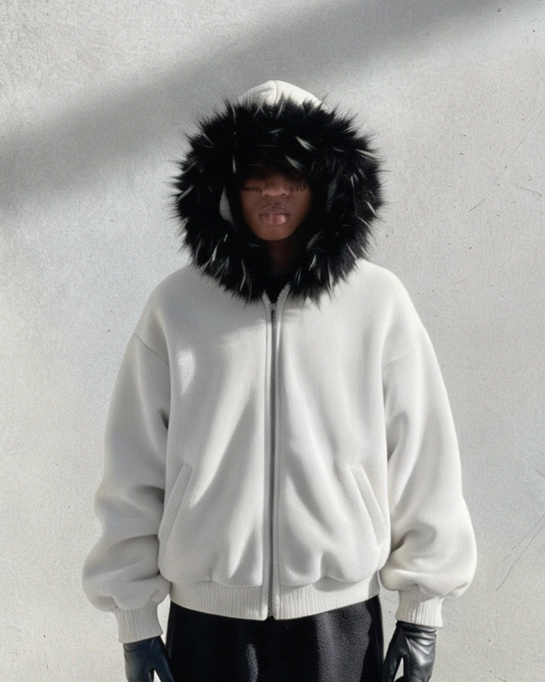 Hood with plush faux fur trim and KIIKIOCLUB embroidery on the back.