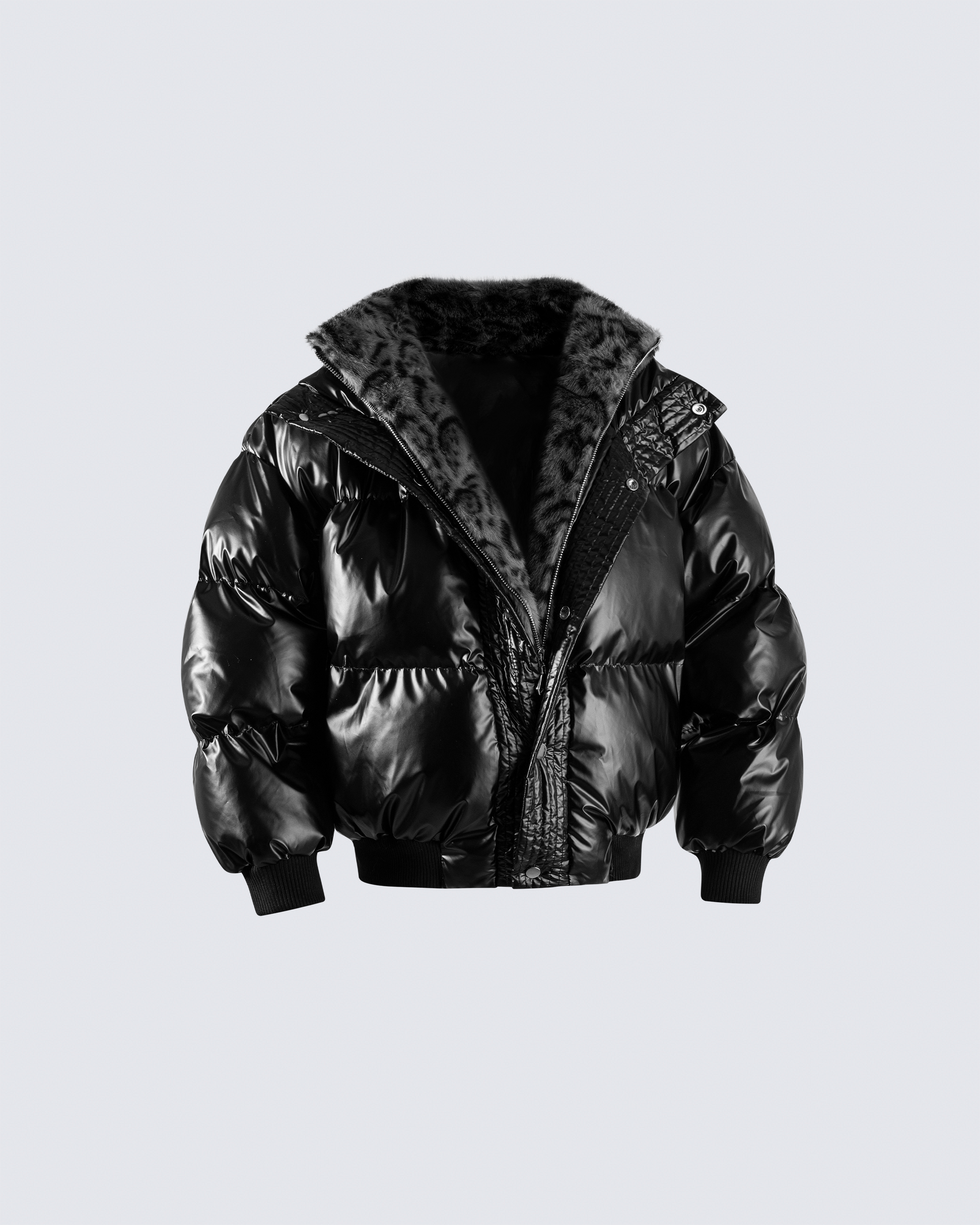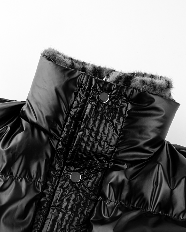 Glossy shell, faux fur collar lining, zip & snap closure, ribbed cuffs and hem