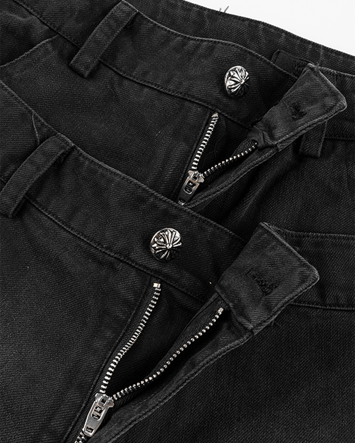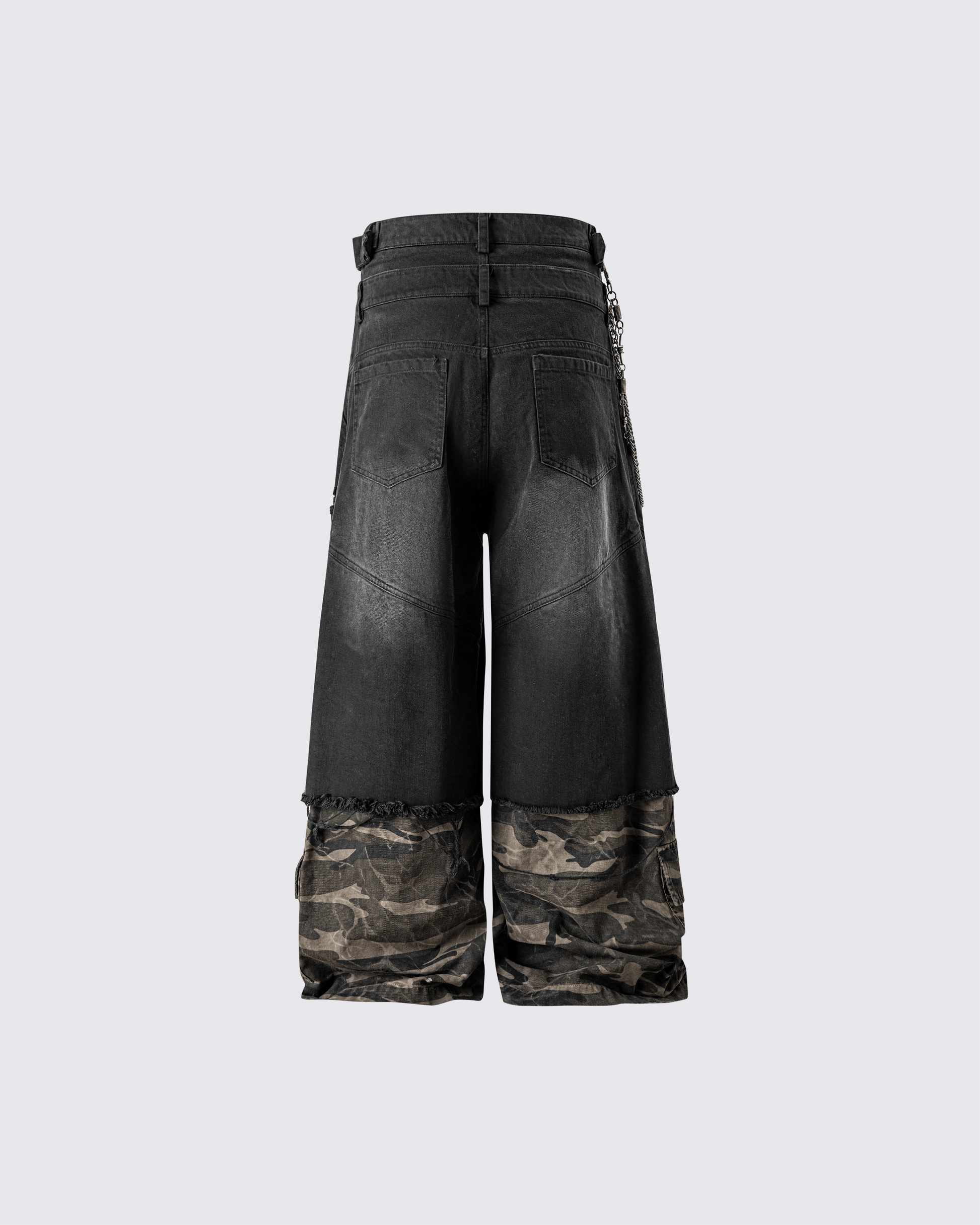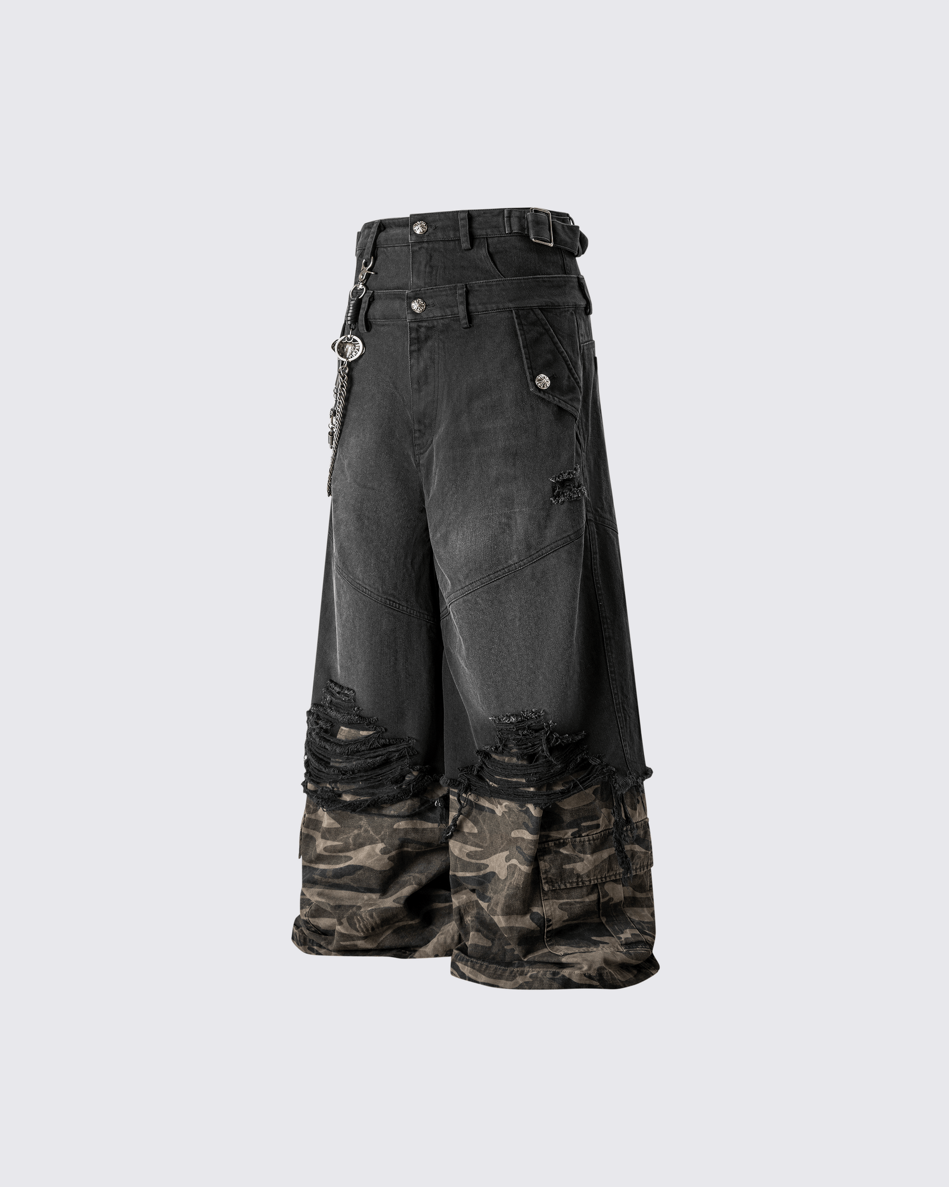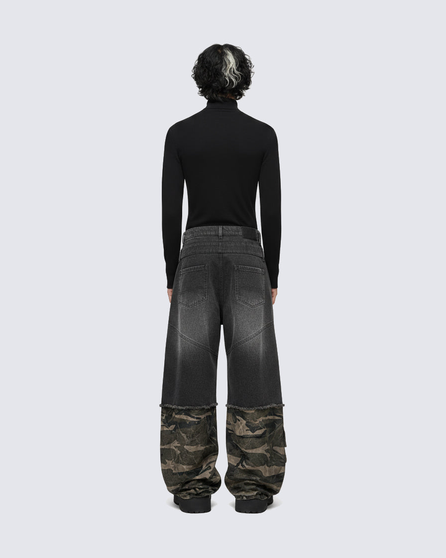 Double-Waist Camo Patchwork Distressed Wide-Leg Pants