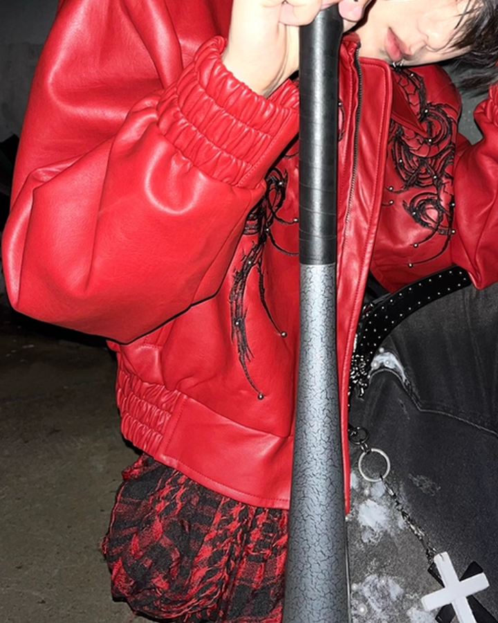 Embroidered Faux Leather Moto Jacket