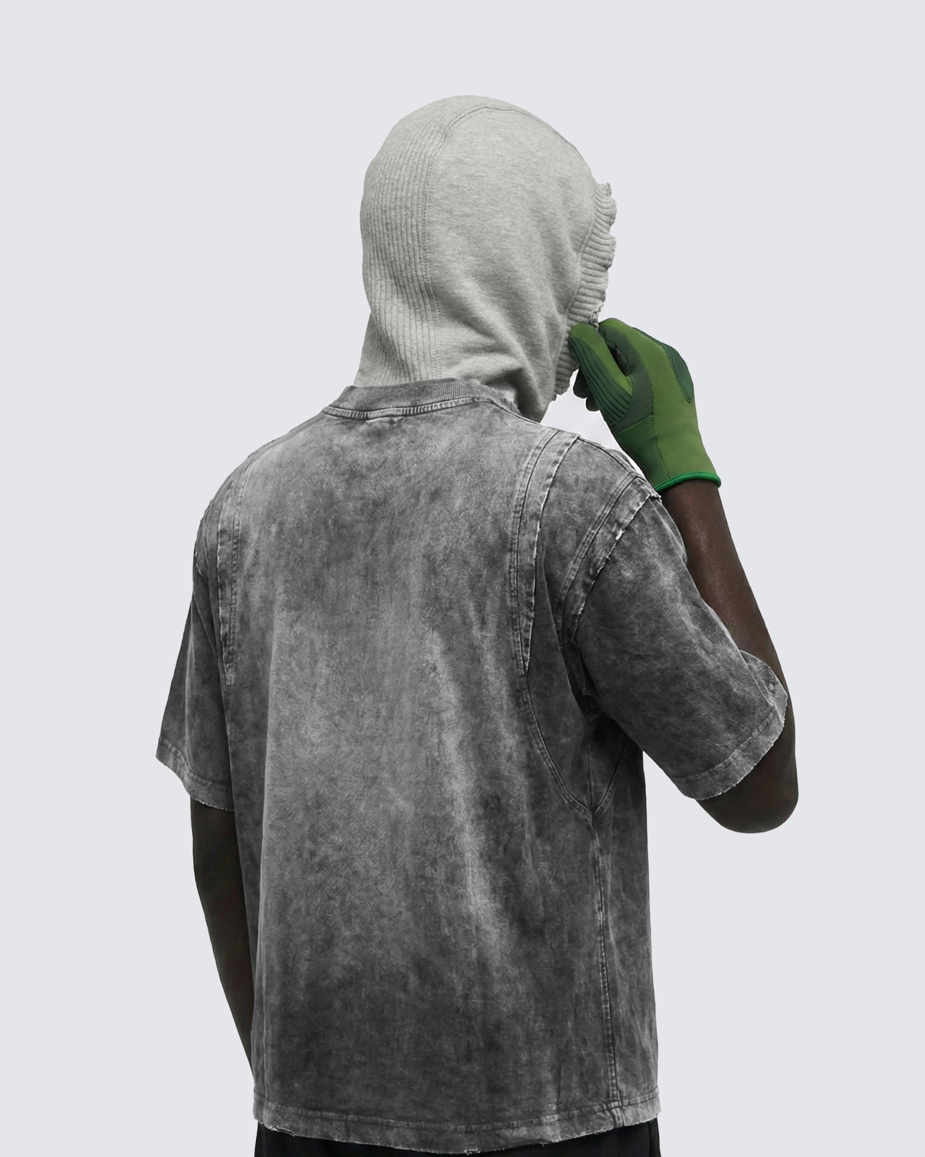 Washed fabric appearance: The garment features an overall washed effect, creating visible fading and uneven color tones.