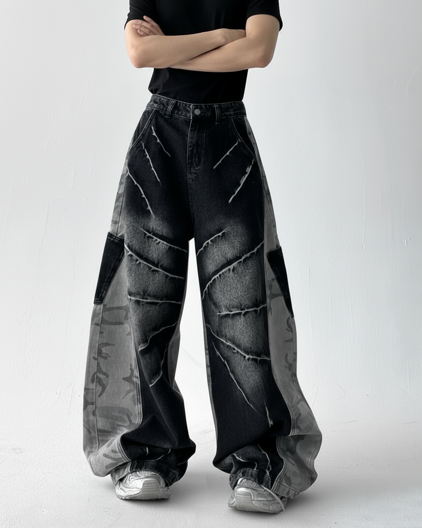 Features a retro American lightning camo wash with bold patchwork detailing, oversized utility pockets, and a flared blade-cut silhouette for a street-ready vintage look.