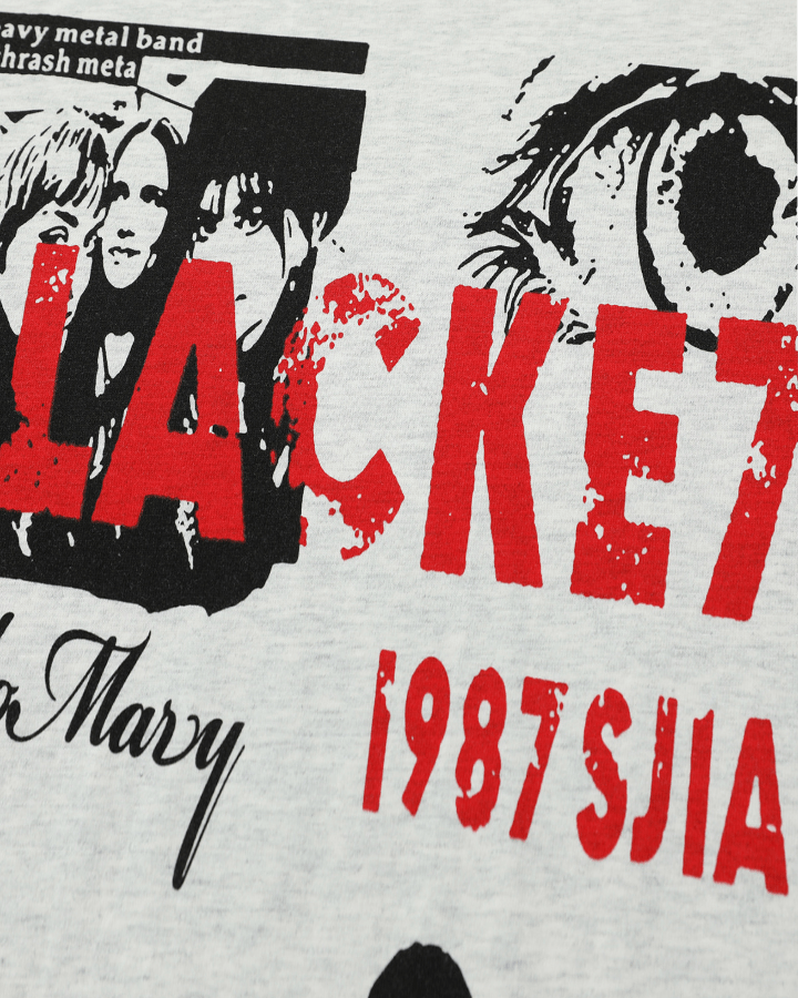 The overall design style of this long-sleeved T-shirt tends to be retro rock and metal music culture, and contains a variety of graphic elements and texts.
