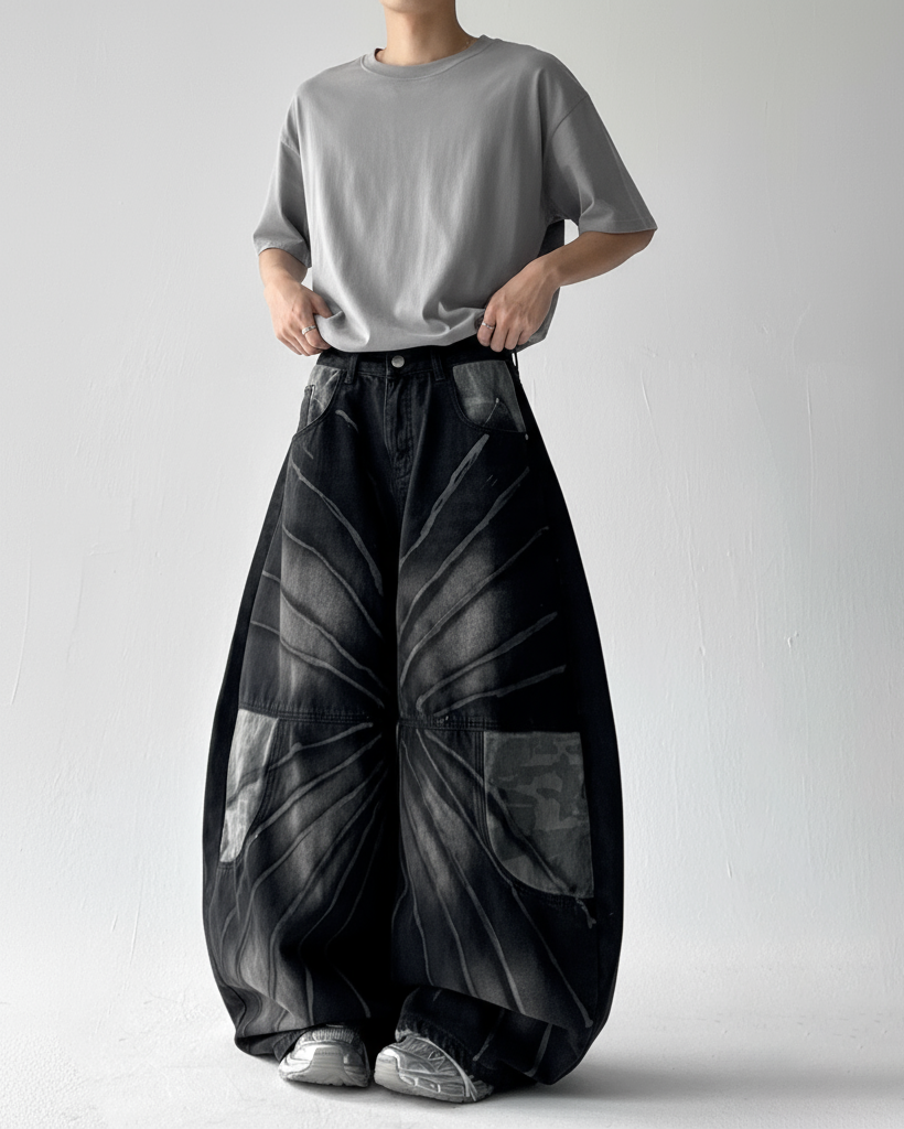 Design Description: Retro-style washed camo patchwork denim with a loose wide-leg blade cut, showcasing a bold streetwear aesthetic and relaxed vintage vibe.