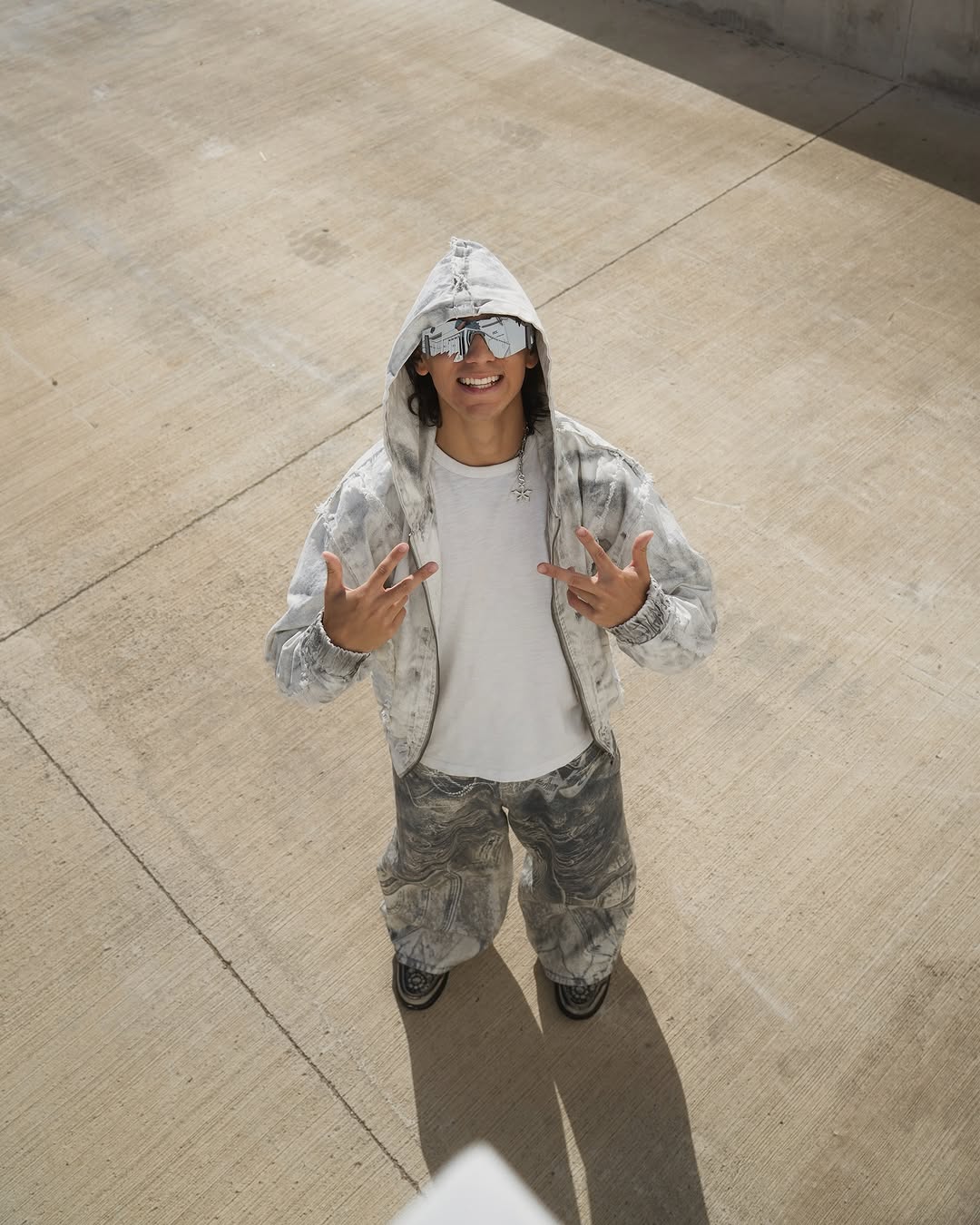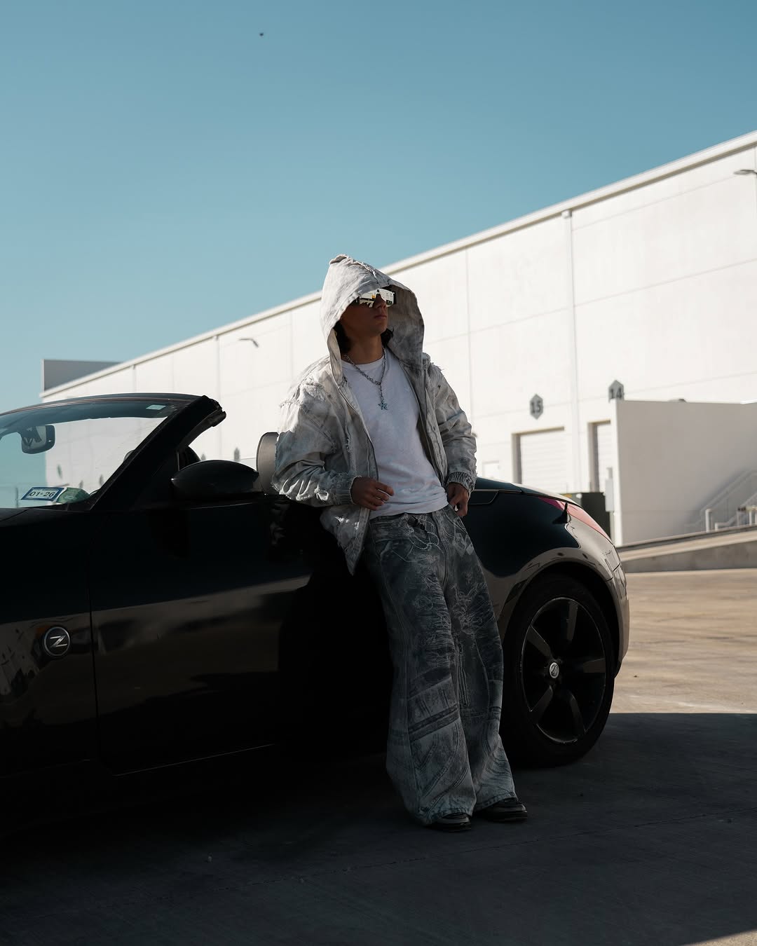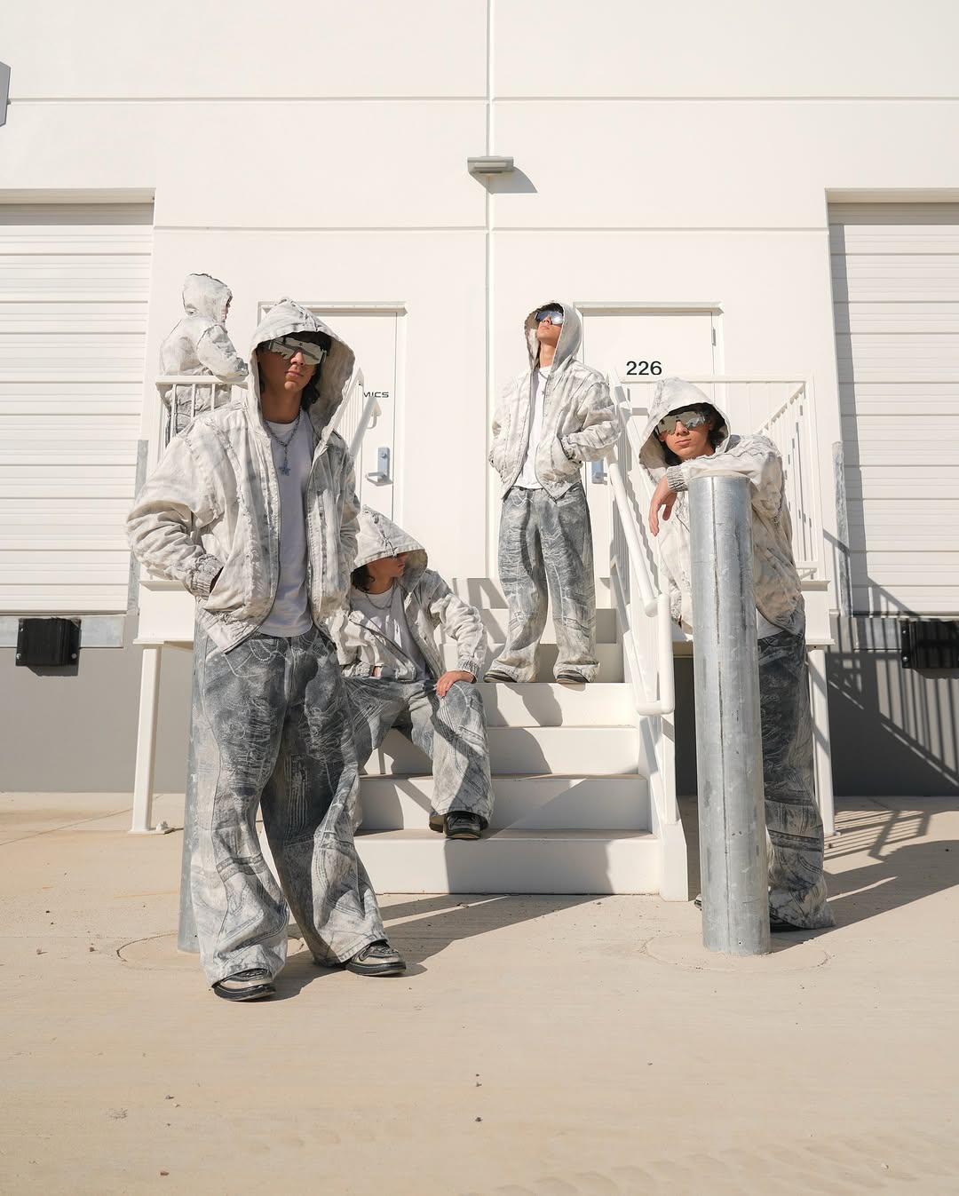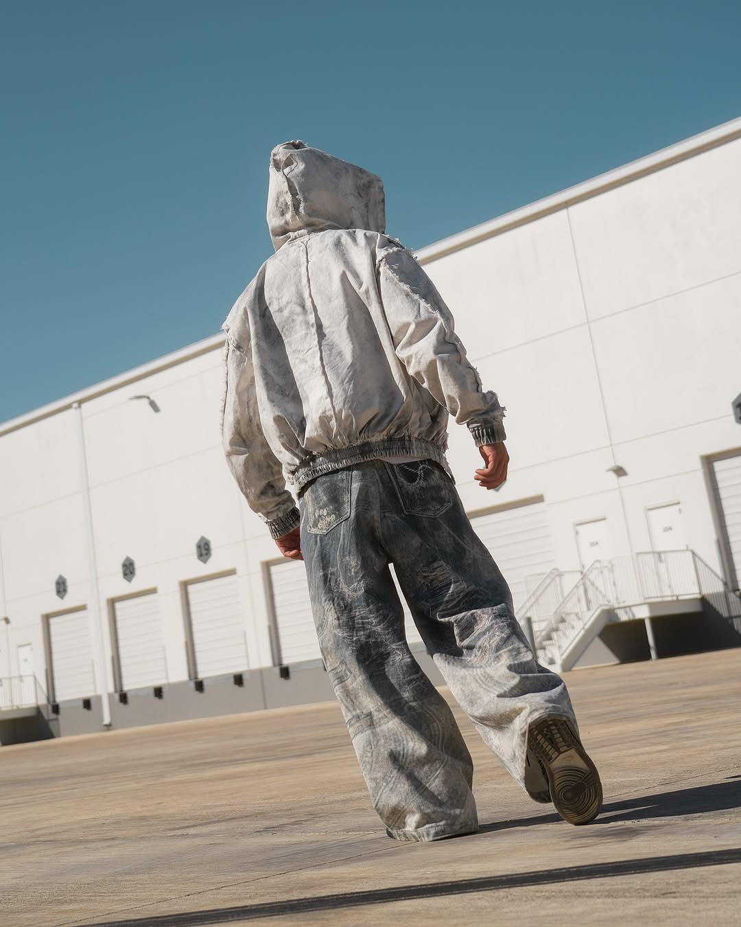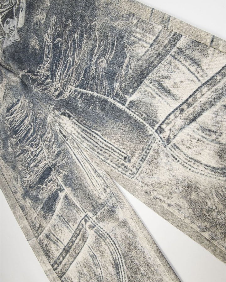 Decorated with artistic prints and distressed elements, adding a touch of vintage charm. Equipped with a classic five-pocket design for both style and functionality. -