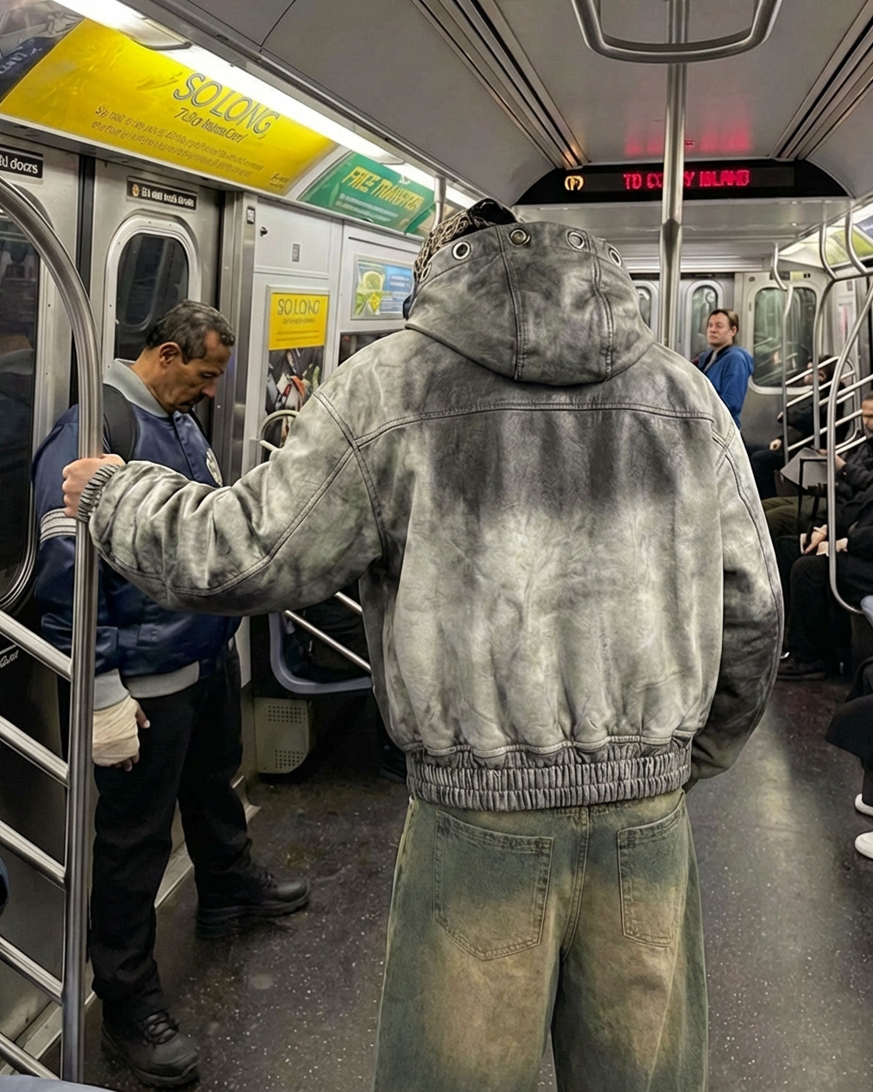Uses washed leather-like fabric combined with spray dyeing, color rubbing, and whisker-effect techniques to create a vintage, nostalgic look with a distinctive and eye-catching visual effect