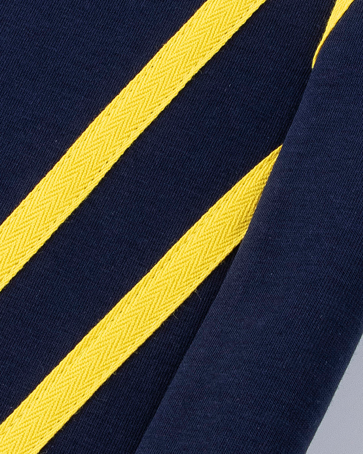 Design Elements: Wide-leg silhouette, bold contrast side stripes, elastic waistband with drawstring, relaxed drape, sporty aesthetic
